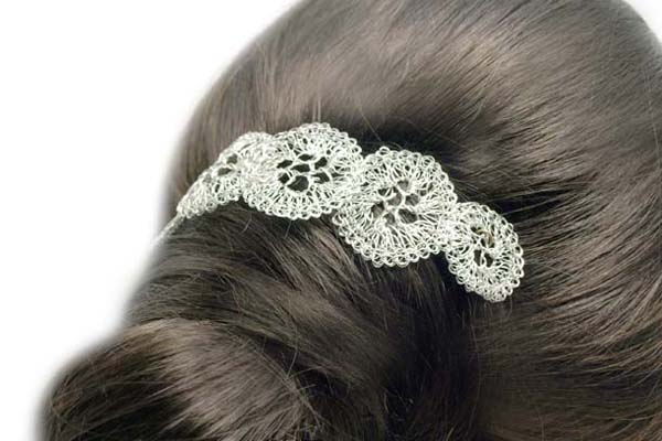Tocado compuesto de 5 círculos tejidos con diseño calado, inspirado en los trabajos de las encajeras de La Orotava (Canarias).
